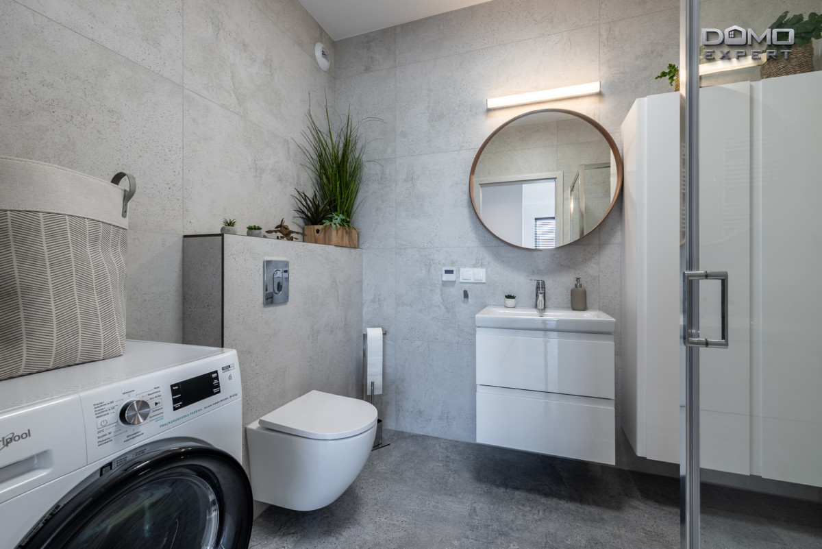 - łazienka z prysznicem i pralką,