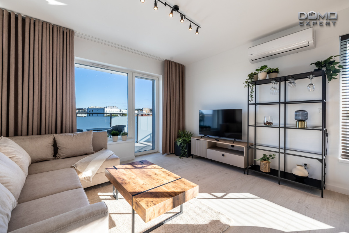 - jasny salon z aneksem kuchennym i kompletnym sprzętem AGD (lodówka, zmywarka, piekarnik, płyta grzewcza),